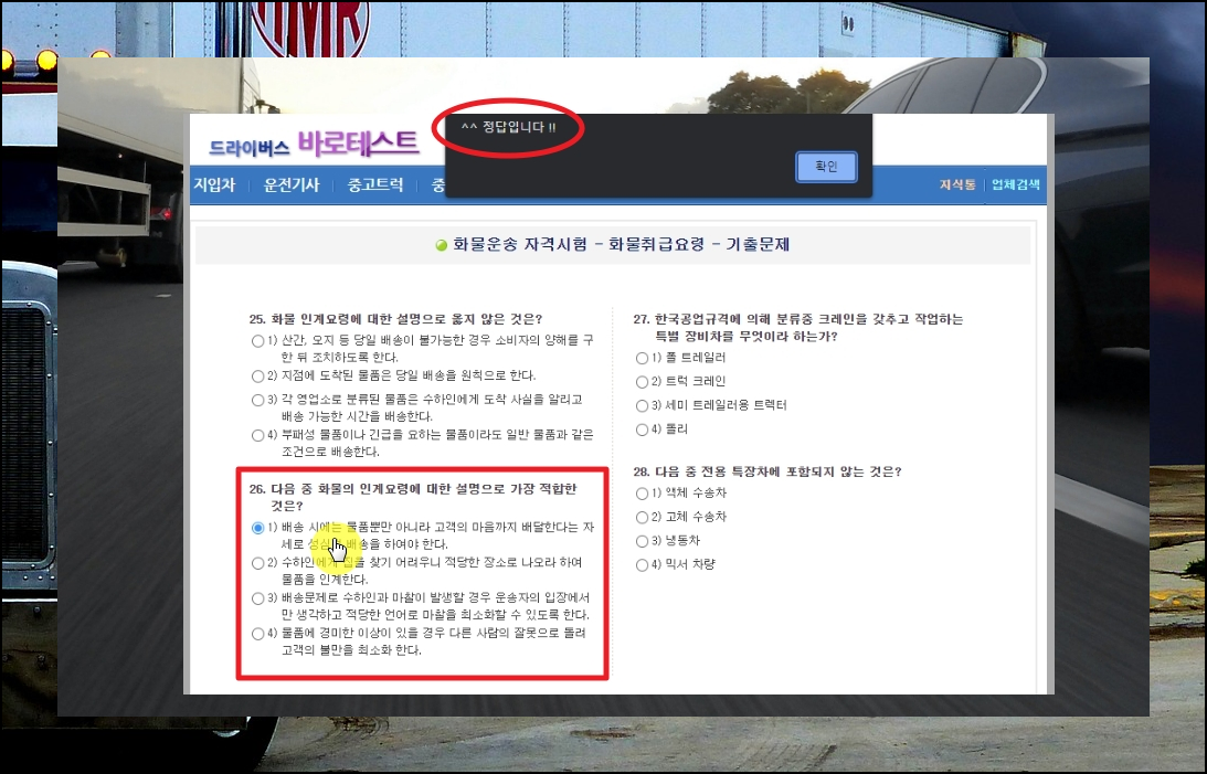 9. 화면에 나타난 기출문제 문항을 읽어보고 답이라고 생각되는 선택지를 마우스로 클릭해 보세요. 그럼 바로 정답 여부를 확인할 수 있어요. 인계요령, 한국공업규격, 전용 특장차 등 운송업에 종사함에 있어서 필수로 알아야 하는 지식을 다루고 있어요.
