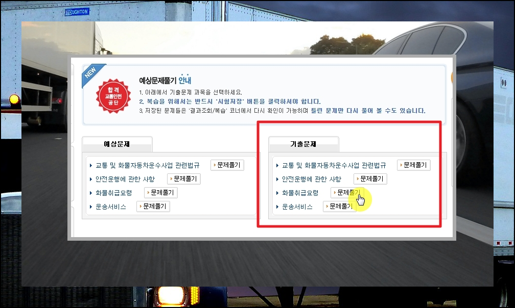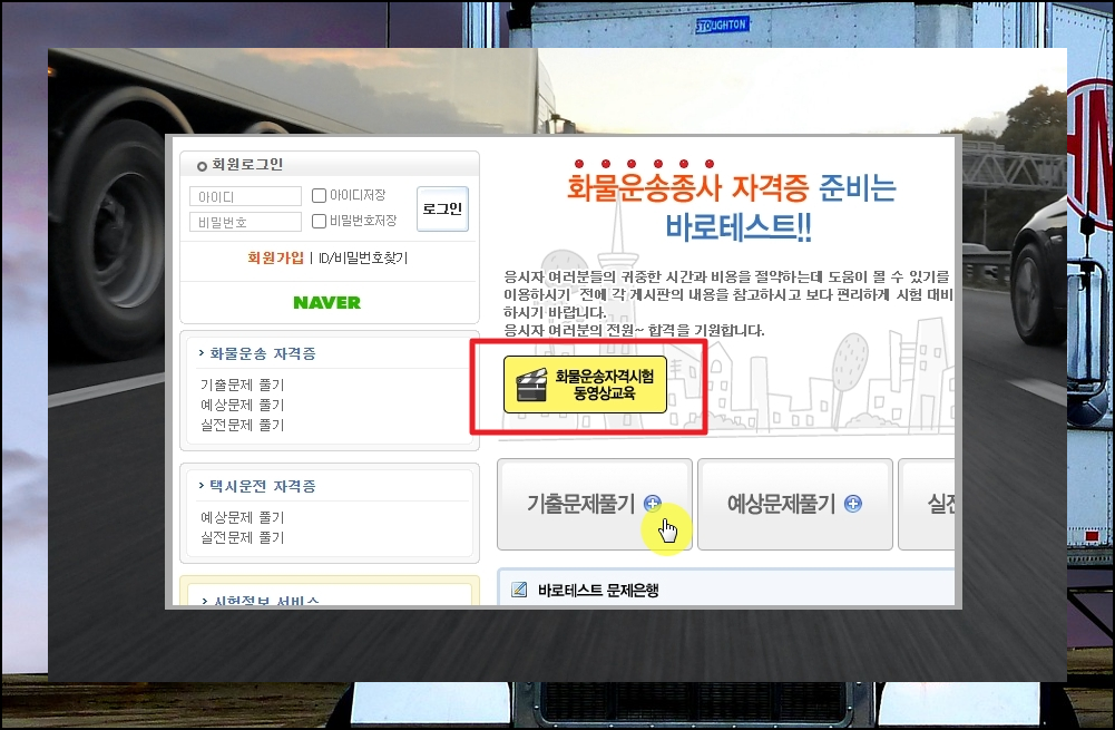 7. 해당 자격증에 관련하여 기출문제, 예상문제, 실전문제를 무료로 풀어볼 수 있도록 되어 있는데요. 추가로 "화물운송자격시험 동영상교육" 자료도 제공하고 있으니 필요한 분은 한 번 재생 시켜 보세요.