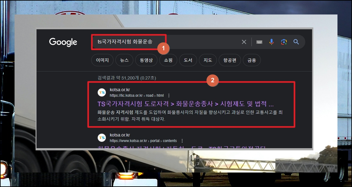 1. 우선 기본서에 해당하는 수험용 참고자료를 다운로드 받도록 하겠습니다. ts국가자격시험 사이트에서 해당 자료를 무상으로 제공하고 있는데요. 번거로운 메뉴 선택을 하기 보다는 "ts국가자격시험 화물운송"을 검색하여 나온 웹페이지를 선택하는 것이 편리합니다.