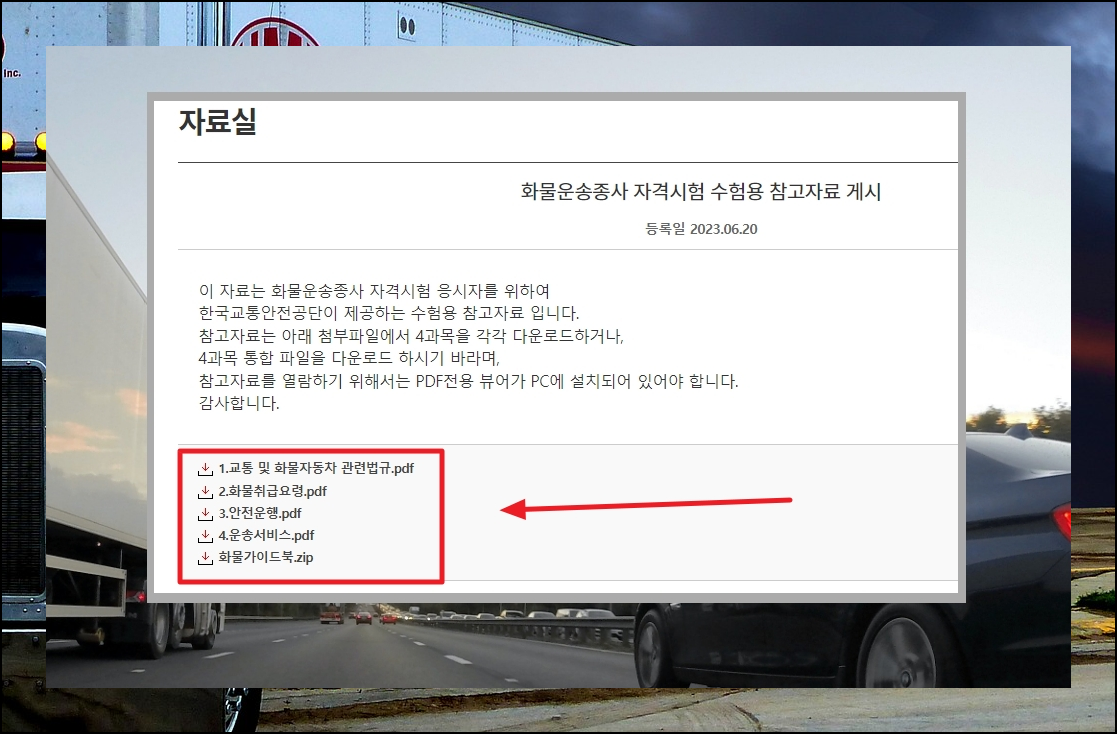 4. 게시물을 열어보면 화물운송 시험의 4가지 과목에 대한 자료를 pdf 파일로 다운로드 받을 수 있습니다. 한 번에 모두 다운로드 받고 싶으면 "가이드북" 압축 파일을 선택하면 됩니다.