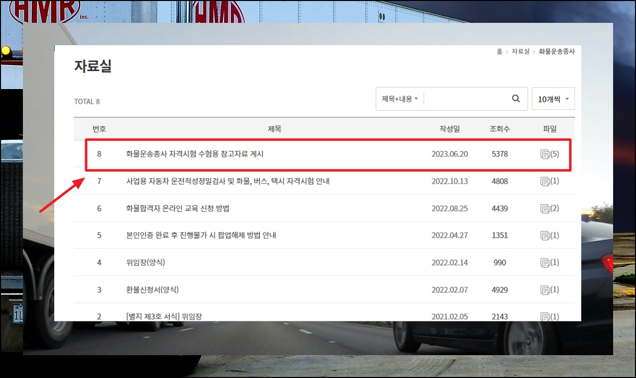 3. 자료실 페이지가 열리면 여러 가지 관련 자료를 다운로드 받을 수 있는 게시판이 나타나는데요. 여기에서 8번 게시물인 "화물운송종사 자격시험 수험용 참고자료 게시"를 선택해 주세요. 2023년 6월 20일에 등록된 최신 자료임에도 불구하고, 벌써 5378회 조회수를 달성했습니다. 그만큼 유용한 자료임을 알 수 있죠.
