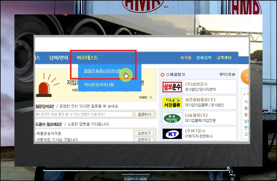 6. 드라이버스 사이트에 접속했습니다. 메뉴에 있는 "바로테스트"를 선택하면 "화물운송종사자격시험"이 나타납니다. 해당 메뉴를 클릭해 주세요.