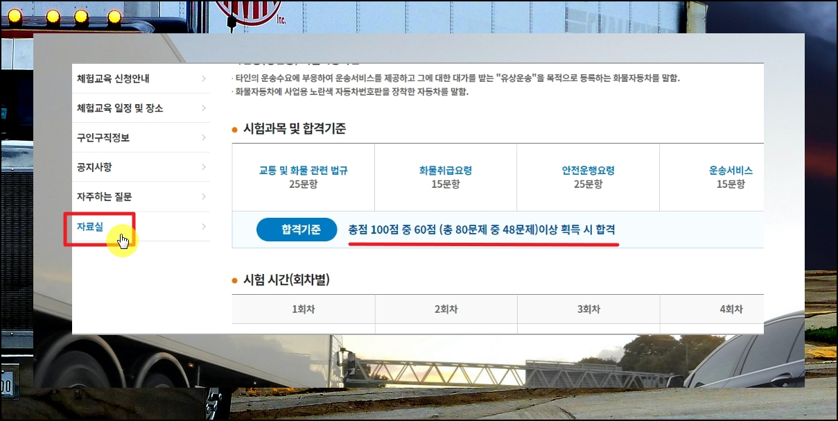 2. 검색하여 접속한 웹페이지가 열리면 해당 시험에 관련된 여러 가지 정보가 나타납니다. 일단 기출문제 자료를 무료로 이용하기 전에 시험과목과 합격기준을 확인해 보세요. 총점 100점 중에서 60점 이상 맞아야 합격인데요. 총 80개의 문항 중에서 48개 이상을 맞춰야 하는 점수입니다. 과목까지 확인했다면 좌측에 있는 메뉴에서 [자료실]을 선택해 주세요.