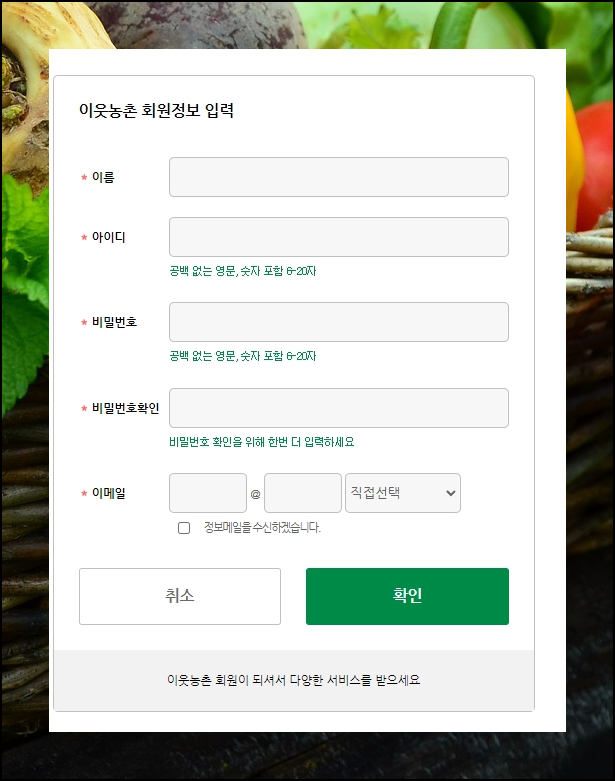가입신청서에는 직거래 사이트에서 활동할 때 필요한 정보를 입력하면 되는데요. 생산자명, 이메일 등의 개인정보와 함께 사이트에서 구매하고 싶은 상품과 이에 관련된 정보를 입력하시면 됩니다.