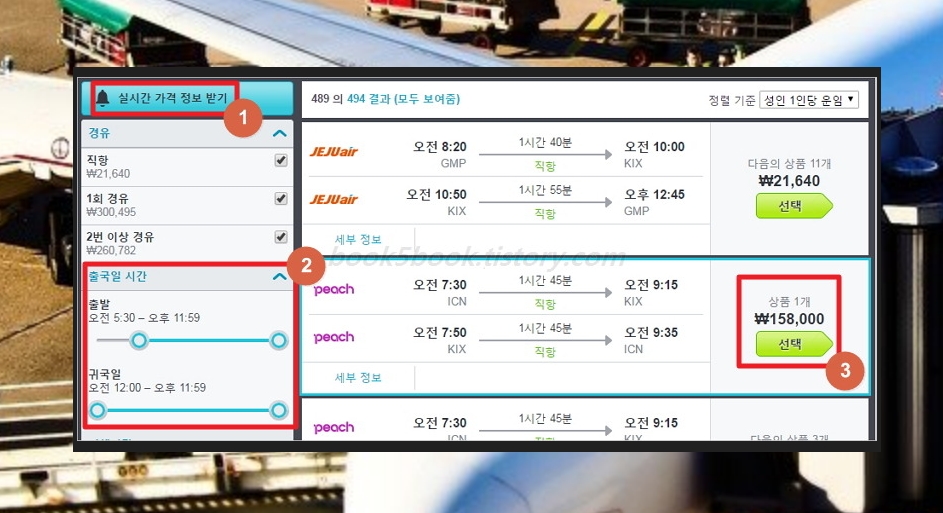 대부분은 같은 날이면 가격이 비슷하지만 성수기때는 비행기표가 부족하기에 시간을 잘봐야 합니다. 그리고 위에 나온 결과는 현재 시각을 기준으로 나온 것이기 때문에 나중에 변동될 수 있습니다. 이를 대비하여 ①번(실시간 가격 정보 받기)를 이용하시면 되는데요. 당장 예약하실꺼면 안하셔도 돼요.