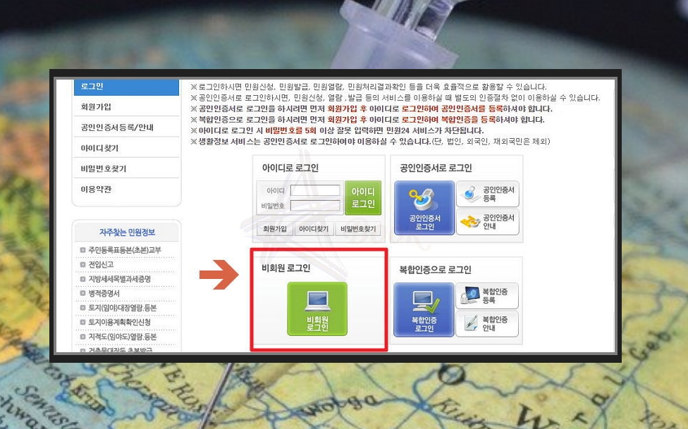 ▼ 예방접종 증명서 발급방법 및 과정 중에서 거의 마지막 단계에 도달했습니다. 민원24 사이트를 로그인 할 차례인데요.