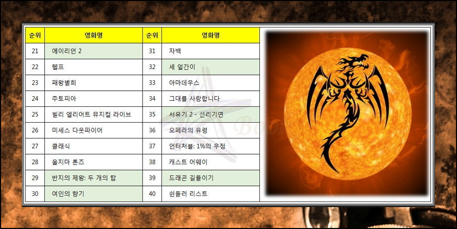 저는 영화를 볼 때 장르보다는 완성도를 따지는 편입니다. 이점을 참고하시어 순위를 참고해주세요. 81위에서 100위 사이에 있는 추천작 중에서 엽기적인 그녀, 라이온 킹, 말할 수 없는 비밀, 폴리스 스토리, 동방불패, 천녀유혼을 뽑았는데요. 천녀유혼을 좋아하는 저로써는 100위인 것이 아쉽네요.