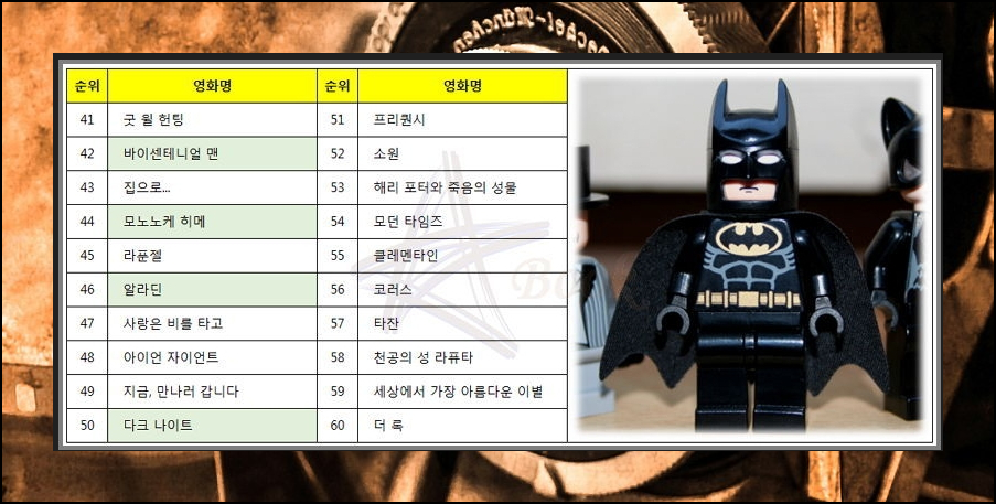 예전에는 다크나이트가 10위 안의 순위권에 있었는데요. 요즘 많이 떨어졌네요. 액션 장르를 좋아하면서 튼튼한 스토리를 원하신다면 다크나이트를 추천합니다. 여러번 봐도 재미있는 영화입니다. 최근에 모노노케 히메(월령공주)를 재미있게 보았는데요. 자연과 인간 그리고 어떻게 살아가야 할지에 대해 곰곰이 생각해보게 되었습니다.