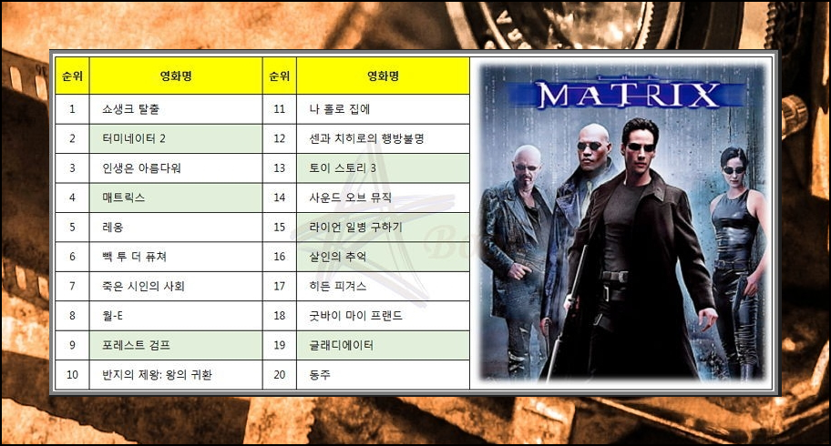 1위를 차지하고 있는 쇼생크 탈출부터 20위에 있는 동주까지 누구나 좋아할 만한 작품들인데요. 지루하신 분들에게 추천하고 싶은 영화는 매트릭스, 라이언 일별 구하기, 글래디에이터 입니다. 볼거리가 많은 작품으로 스토리 또한 너무 좋습니다.