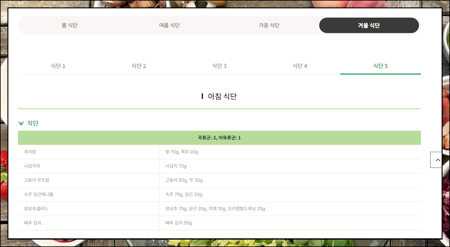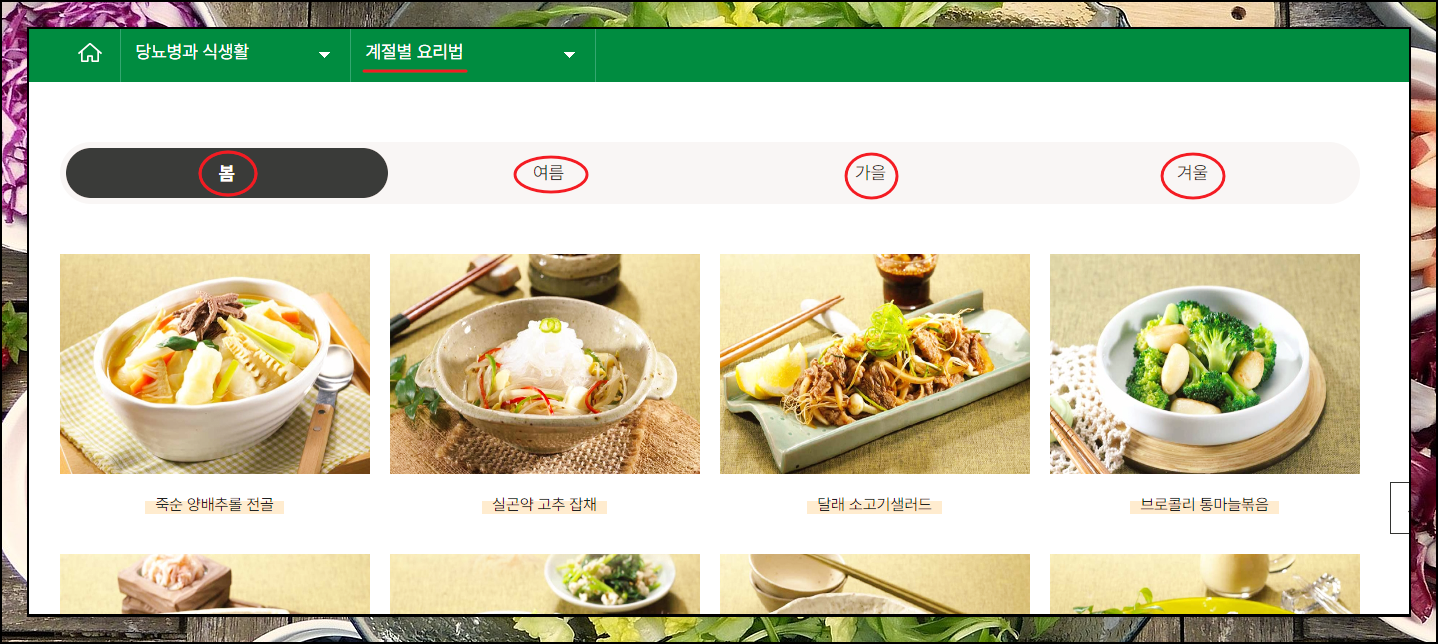 봄, 여름, 가을, 겨울 이렇게 4계절에 대하여 5일치 식단을 확인할 수 있는 페이지가 열렸습니다. 총 20일치에 해당하는 것이기 때문에 서로 다르게 배치한다고 해도 당뇨 식단표 1주일 분량을 4개나 만들 수 있습니다. 요리의 이름은 물론이고, 해당 요리에 들어가는 재료의 양도 알려주기 때문에 얼마나 섭취하면 되는지 참고할 수 있습니다.