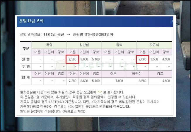 예매해보니 7300원 맞네요. 일반실 어른 기준으로 말씀 드린 것이기 때문에 어린이와 노인분, 그리고 자유석을 이용하면 더욱 저렴합니다.