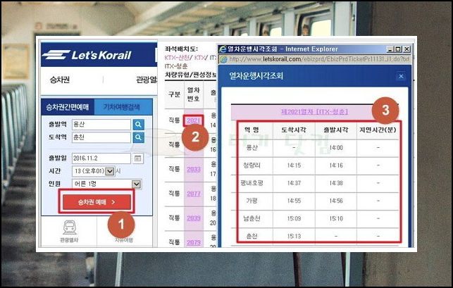 ITX 청춘열차 예매를 해보세요. 예매버튼은 레츠코레일 홈페이지의 처음 페이지 좌측에 있는데요. 용산, 춘천을 입력하고 누르면 시간에 따른 편성정보가 나온답니다. 여기서 열차번호를 누르면 간단한 노선 시간표를 알 수 있는데요. 이를 한번 더 참고하셔서 예매를 진행하시면 됩니다.