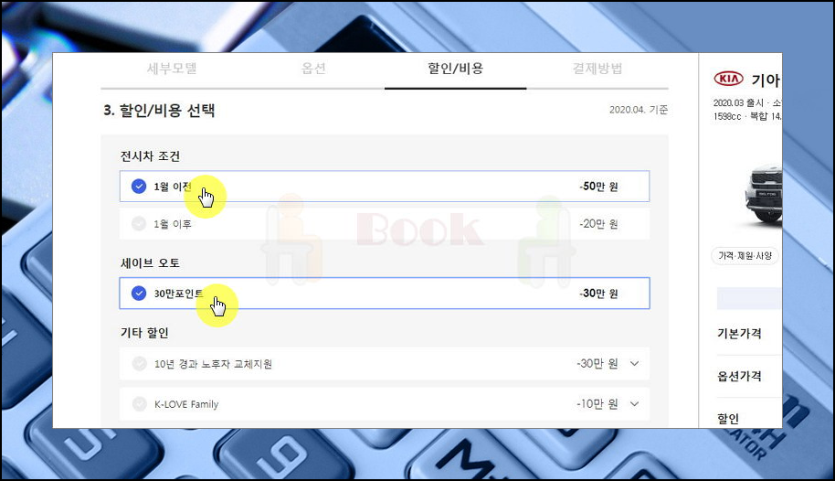 앞서 언급한 자동차 판매조건을 선택할 수 있어요. 여기서 받을 수 있는 조건을 선택하면 견적에 자동으로 적용이 돼요.