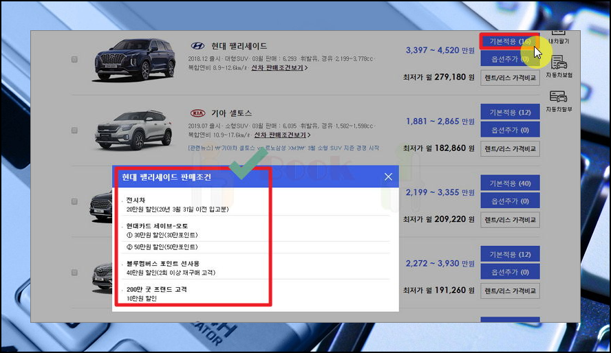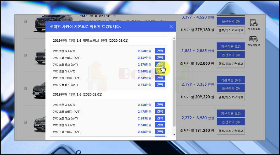 리스트에서 가장 우측에 있는 [기본적용] 버튼을 클릭해 보세요. 그럼 견적을 받을 수 있는데요. 원하는 등급 또는 트림을 선택해 주세요.