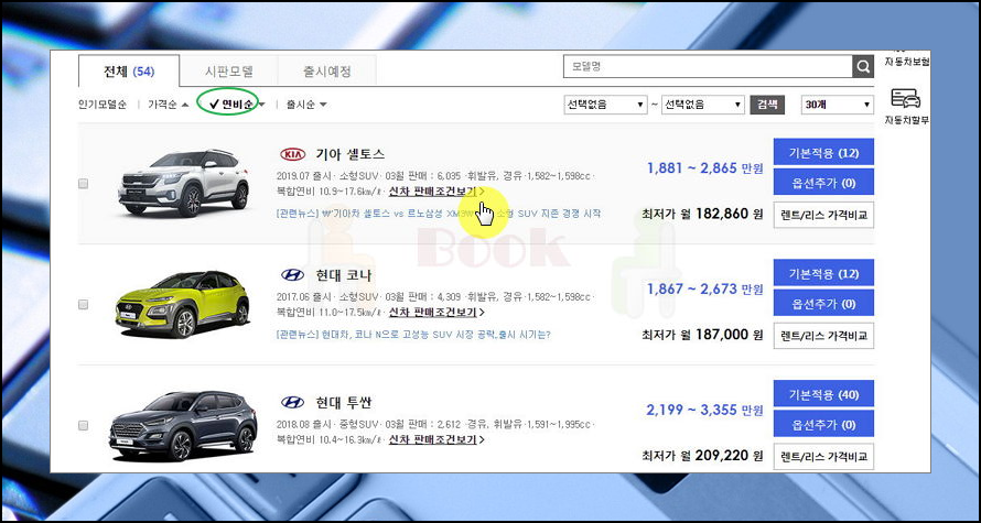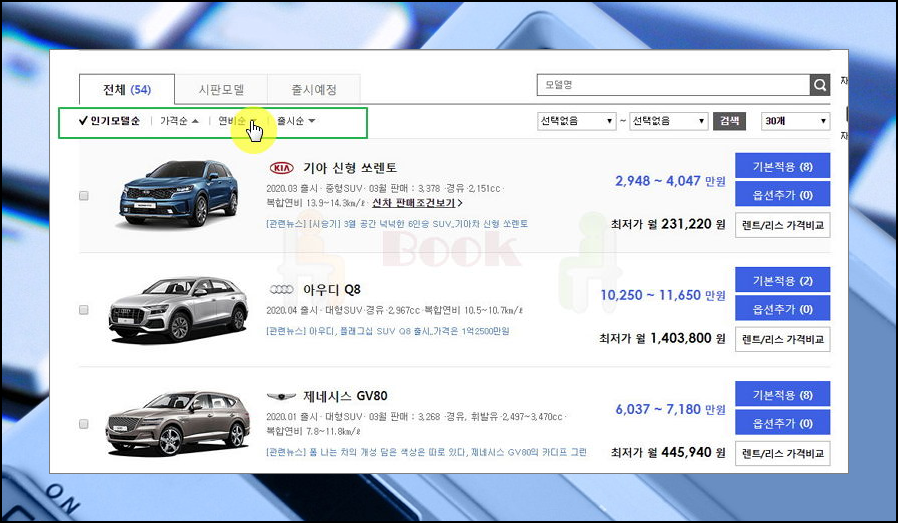 이렇게 연비가 높은 모델도 찾아볼 수 있어요. 사이트에서 제공하는 정렬 기능을 통해 리스트를 잘 활용해 보세요.