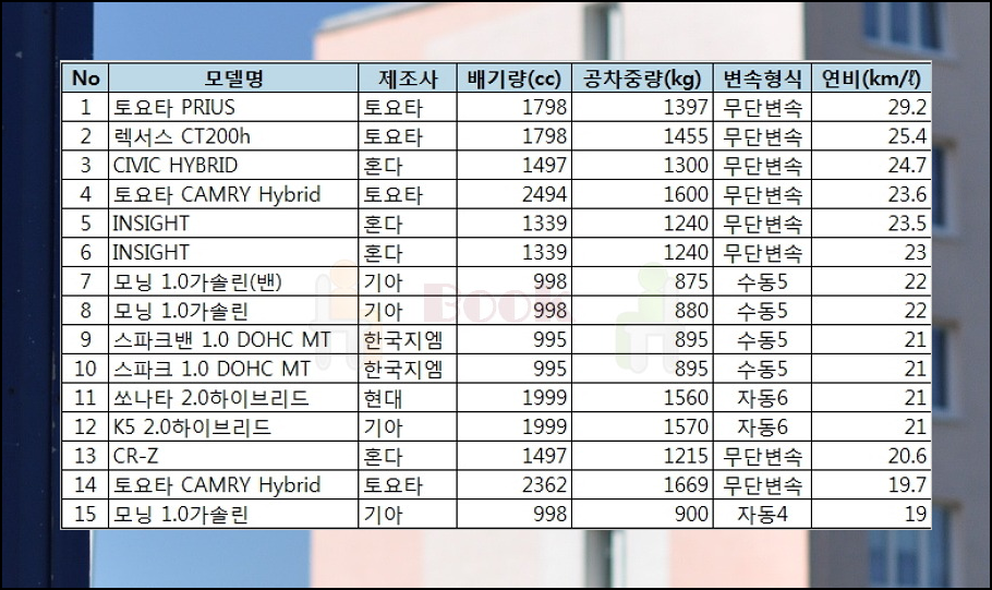 가솔린 자동차의 연비 순위 (출처 - 에너지 관리공단)를 살펴보겠습니다. 일반적으로 공인연비는 국가에서 규정한 시험법 및 절차에 따라 공인시험기관에서 측정한 수치인데요. 에너지관리공단 수송에너지 사이트에 가시면 모든 자동차의 공인연비를 확인해 볼 수 있답니다. 1위부터 5위까지는 일본차가 차지했지만, 나머지 순위에는 국산차도 많이 있네요.