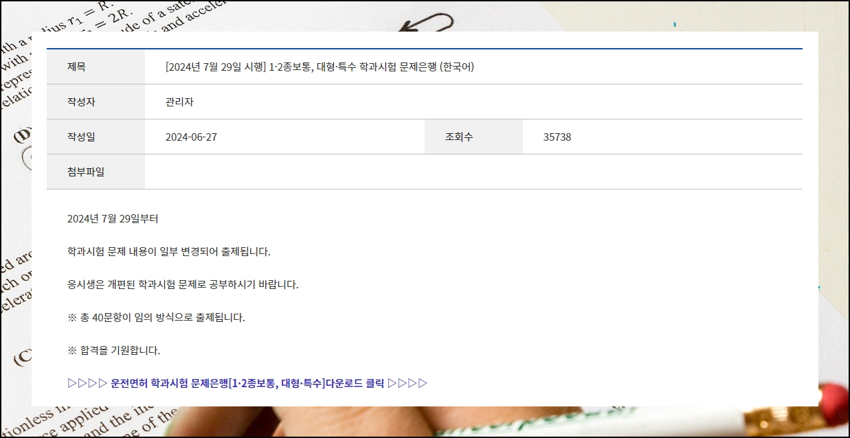 4가지 종류의 게시 글을 확인 하실 수 있는데, 이 중에서 자신이 시험을 봐야 할 면허와 관련된 게시 글을 선택하시면 되는데 1,2종의 경우에는 합격 점수만 틀리고 출제되는 문제가 같기 때문에 1.2종 자료를 선택하시면 된답니다.