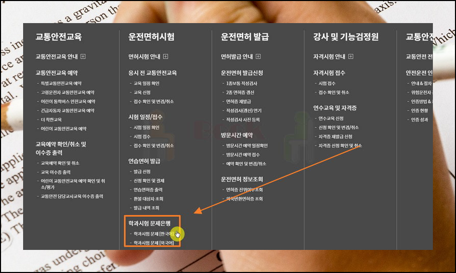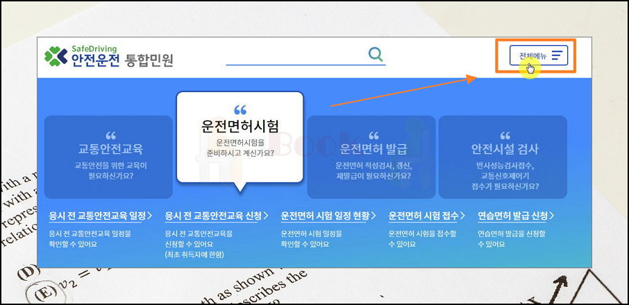 오른쪽 상단에 전체 메뉴를 클릭하시면 운전면허 시험문제 파일을 다운 받으실 수 있는 학과 시험문제 라는 메뉴를 클릭해주시면 돼요.