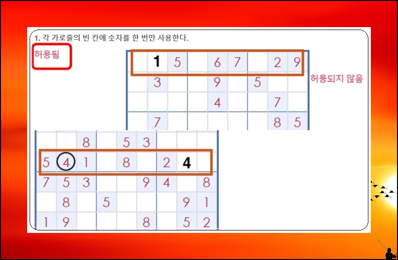 셋째, 각각의 작은 정사각형(구역)의 빈칸의 숫자를 한 번만 사용한다.
