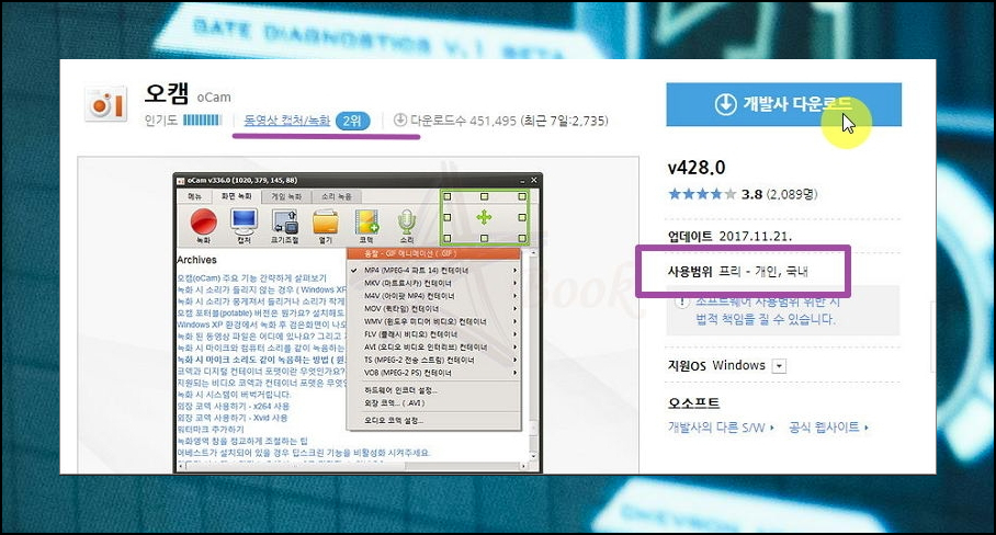 오캠으로 말할 것 같으면 네이버 소프트웨어 자료실의 동영상 캡쳐 및 녹화하는 프로그램 분야에서 2위를 차지한 소프트웨어에요. 사용범위에 '프리'라고 적혀 있는데요. '프리웨어'를 줄임말이에요. 처음 영상 제작을 하신다면 이러한 무료로 사용할 수 있는 동영상 녹화 프로그램을 사용하는 것이 좋아요.