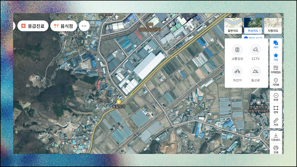36,000km 상공에서 우리나라를 지켜보는 위성이 전해주는 영상으로 실제 모습의 땅과 건물을 관찰할 수 있어요. 정보보기 기능을 이용하면 어떤 건물이 무엇을 하는 곳인지 명칭을 통해 알 수 있죠. 우리나라에는 산지가 많은 것이 쉽게 눈에 띕니다. 교통정보, CCTV, 등산로, 자전거 도로를 알아볼 수 있는 서비스도 제공하오니 함께 이용해 보시길 바랍니다.