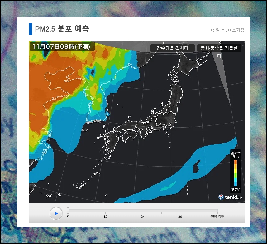 PM2.5 분포 예측을 클릭해 보세요. 파란색 계열이 강할수록 깨끗한 공기를 의미하니, 직관적으로 이해하실 수 있습니다. 빨간색이나 보라색으로 표시되는 지역은 미세먼지 농도가 높은 곳이니 외출 시 마스크 착용을 꼭 준비하는 것이 좋아요.