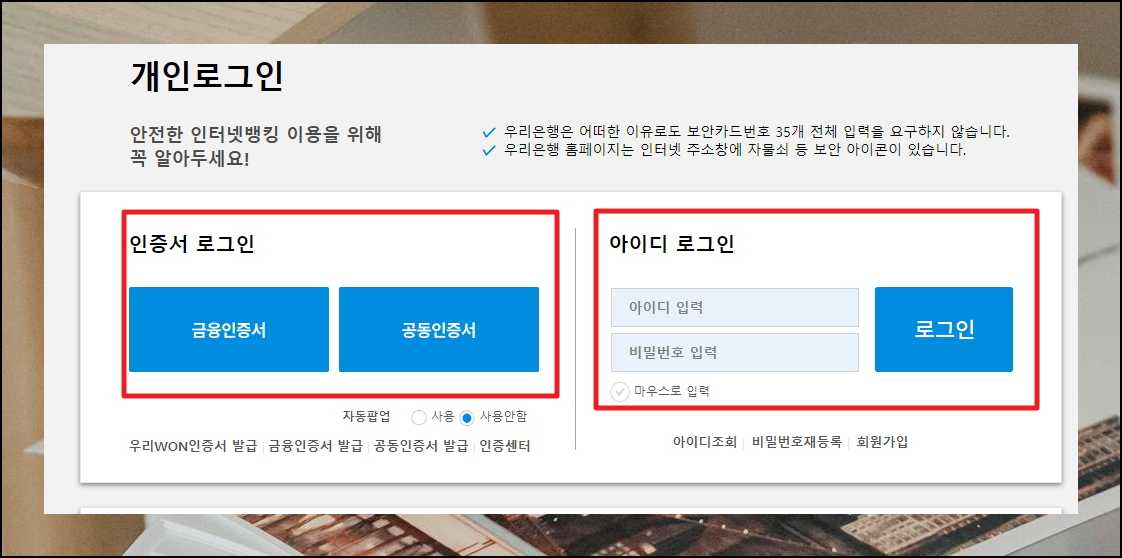 요즘은 은행 업무의 대부분을 인터넷으로 처리할 수 있어요. 덕분에 은행을 직접 방문하는 일이 많이 줄었는데요. 이제는 집이나 사무실에서도 인터넷을 이용하면 다양한 은행 업무를 처리할 수 있습니다. 로그인을 할 수 있는 인증서 또는 아이디와 비밀번호를 준비해주세요. 추가적으로 필요할 수 있는 보안카드나 OTP도 가까이 두시면 좋아요. 금융거래확인서에 관련하여 특수한 경우에는 휴대폰 인증이 필요할 수도 있으니 염두하시길 바랍니다.
