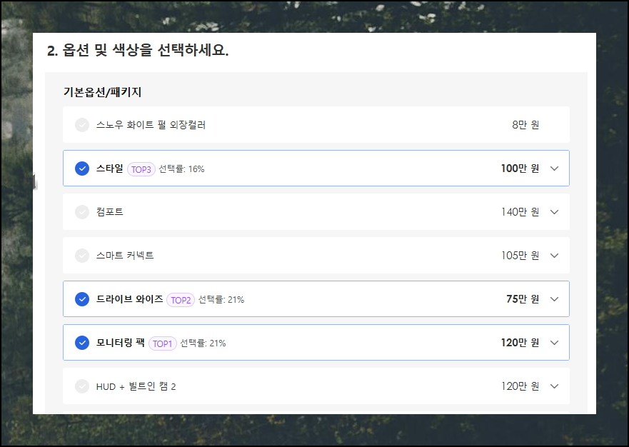 이제 실제 구매 금액을 계산해볼 차례입니다. 카니발 모델별로 400만 원에서 500만 원 정도의 가격 차이가 있으니 참고하세요. 9인승 모델의 가격표를 보면 인기 모델은 TOP 표시가 되어있어 선택에 도움을 줄 수 있습니다. 원하는 조건들을 클릭하면 자동으로 가격이 계산되니 편리하죠.