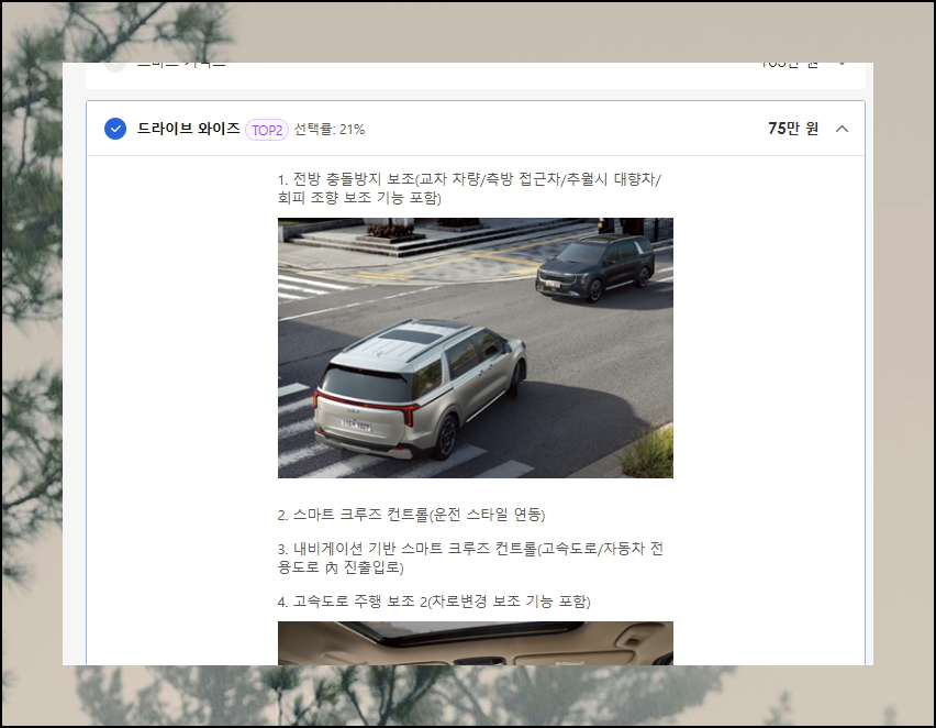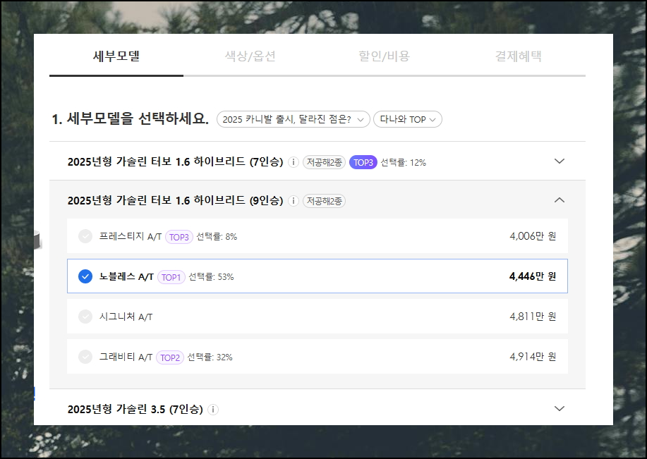이제 실제 구매 금액을 계산해볼 차례입니다. 카니발 모델별로 400만 원에서 500만 원 정도의 가격 차이가 있으니 참고하세요. 9인승 모델의 가격표를 보면 인기 모델은 TOP 표시가 되어있어 선택에 도움을 줄 수 있습니다. 원하는 조건들을 클릭하면 자동으로 가격이 계산되니 편리하죠.