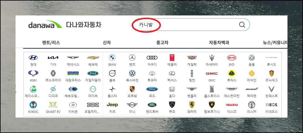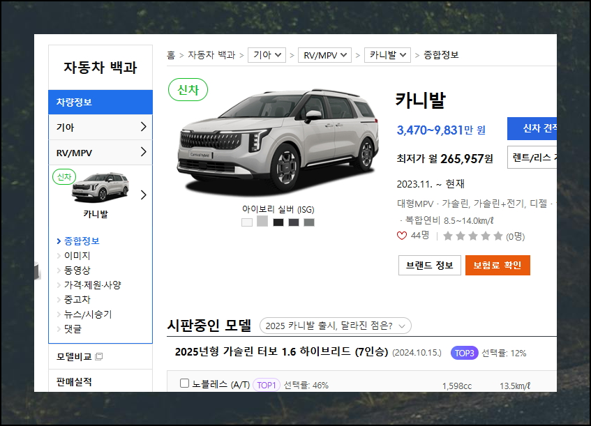 사이트는 다양한 자동차 관련 서비스를 제공하고 있어요. 메인 화면 상단의 검색창에 "카니발"을 입력하면 원하는 정보를 빠르게 찾을 수 있습니다. 9인승 모델부터 렌트, 중고차까지 폭넓은 정보를 한눈에 볼 수 있죠.