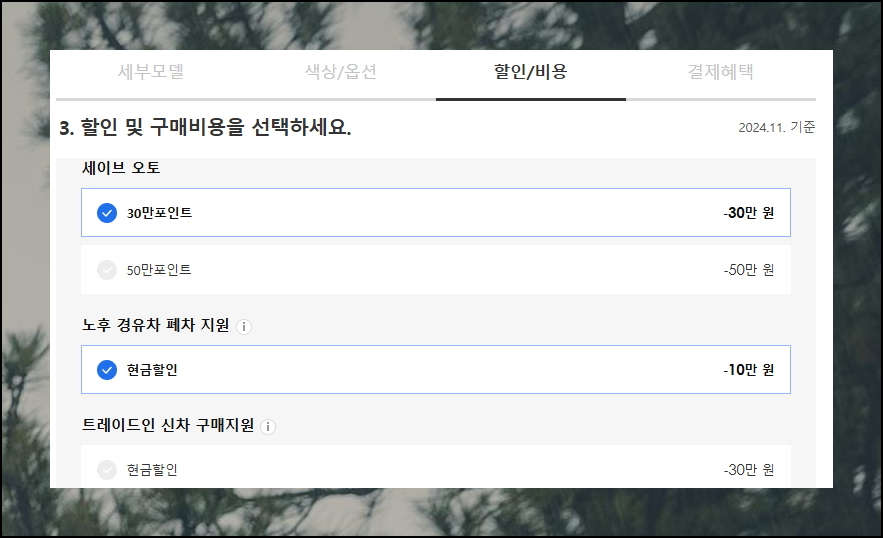 할인 혜택을 적용하면 구매 가격을 낮출 수 있어요. 카니발의 2024년 11월 기준 가격표와 판매 조건표를 참고하여 적용 가능한 혜택을 선택해주세요. 선택한 혜택만큼 최종 가격이 감소됩니다.