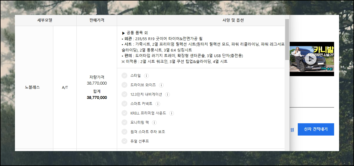 색상과 옵션 선택이 다음 단계예요. 카니발 모델의 가격표를 보면 옵션을 추가할 때마다 금액이 올라가지만, 색상 변경은 추가 비용이 없습니다. 본인의 취향과 필요에 맞게 선택해보세요.