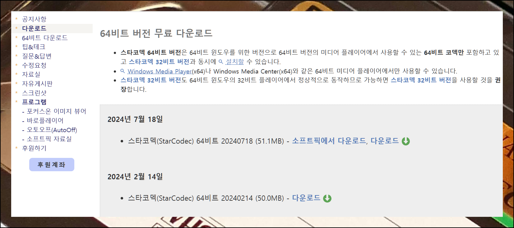 통합코덱 공식 웹사이트 방문 후 왼쪽 메뉴에서 다운로드를 선택하시면 됩니다. 현재는 대부분의 사용자가 64비트 윈도우를 사용하므로, 그에 맞는 버전을 선택하여 설치하시면 됩니다. 무료로 제공되는 프로그램이니 설치하기 전에 부담을 느낄 필요가 없어요. 마음껏 설치하고, 사용이 가능합니다.