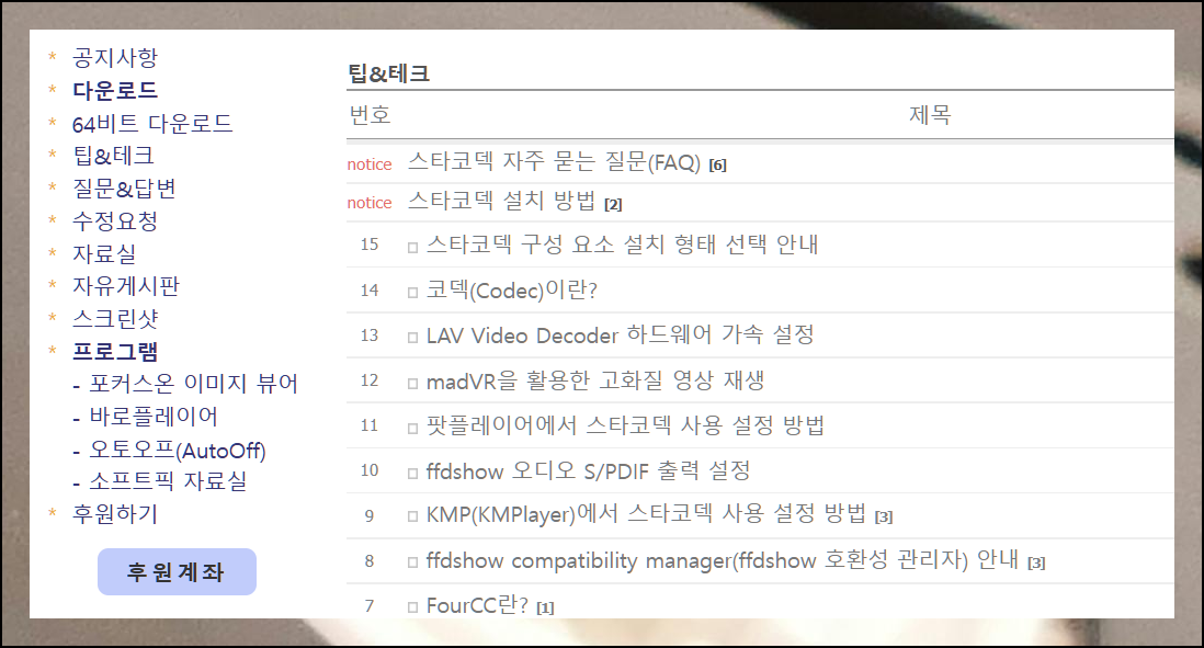 통합코덱 사용 중 발생할 수 있는 다양한 상황에 대한 해결책이 준비되어 있습니다. 왼쪽 메뉴의 팁&테크 섹션에서 설치하기 가이드, 플레이어별 설정 방법, 화질 조정 등 상세한 매뉴얼을 확인할 수 있어요. KM 플레이어 사용자를 위한 통합코덱 설정 가이드도 포함되어 있습니다.