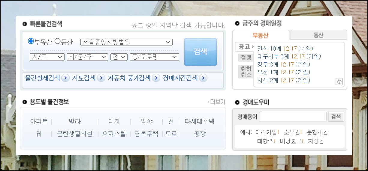 사건번호를 모르거나 로그인이 어려운 상황에서는 빠른물건검색을 이용하면 됩니다. 원하는 부동산이나 동산의 주소만 입력하세요. 아파트, 빌라 같은 주거용 건물은 물론 상업시설까지 용도에 따라 구분해서 찾아볼 수 있어요.