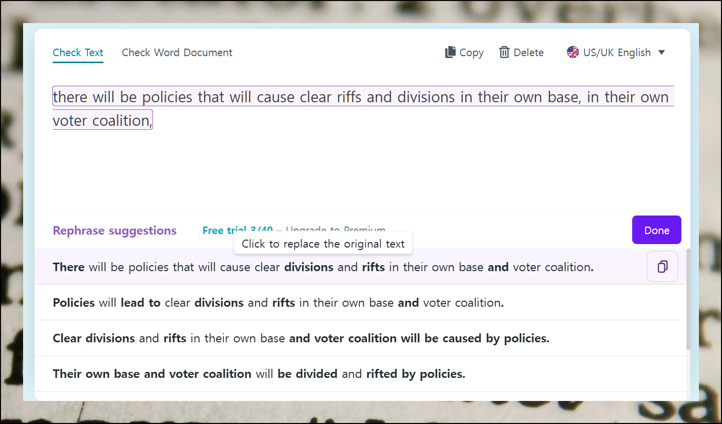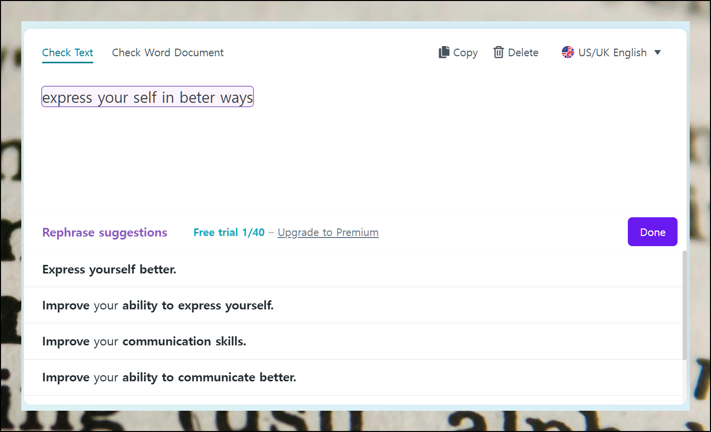 입력한 문장에 대해 더 나은 표현을 추천받을 수 있어요. 인터넷 사용 중에도 검사기의 도움을 받을 수 있어 매우 편리합니다. 영문법 실력이 자연스럽게 향상될 거예요.