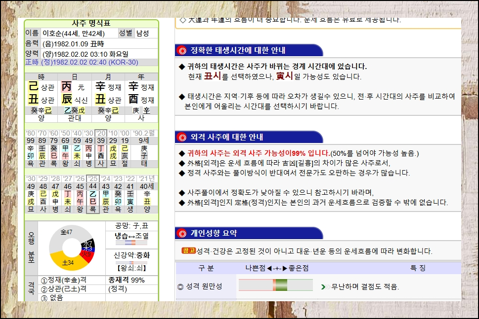 사주풀이 도우미에서 제공하는 사주 명식표로 시작해서 오행과 격국, 대운, 연운까지 전문가의 상세한 해석을 무료로 받아볼 수 있습니다. 마치 타로 카드를 펼쳐보듯 당신의 운명을 살펴보세요. 앞날의 길잡이가 되어줄 소중한 정보들이 기다리고 있어요.