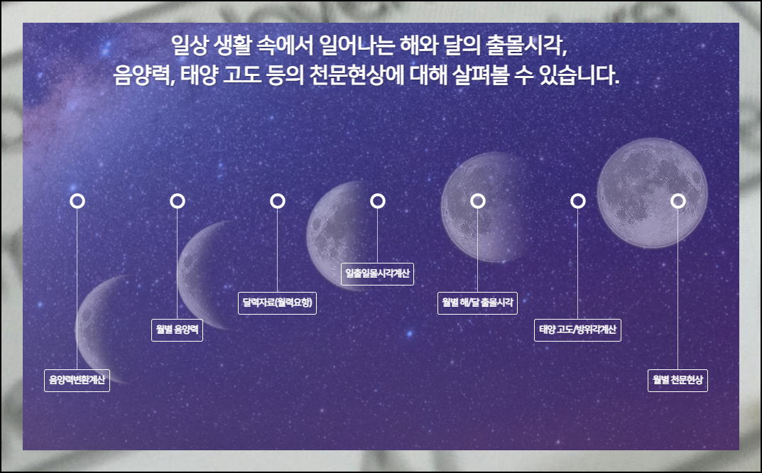 메인 페이지에서는 달력자료, 일출일몰 시각계산, 월별 해와 달 출몰시간 등 다양한 서비스를 확인할 수 있어요. 자동환산 방법도 쉽게 찾아볼 수 있도록 구성되어 있습니다.