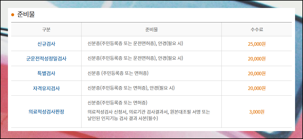 안경 착용자는 꼭 안경을 가져가야 하고, 신분증과 수수료도 필수예요. 특히 의료적성검사를 받으실 분들은 다행히도 3,000원이라는 저렴한 비용으로 받아볼 수 있습니다. 이렇게 테스트 종류에 따라 준비물이 다르니 잘 확인하세요.