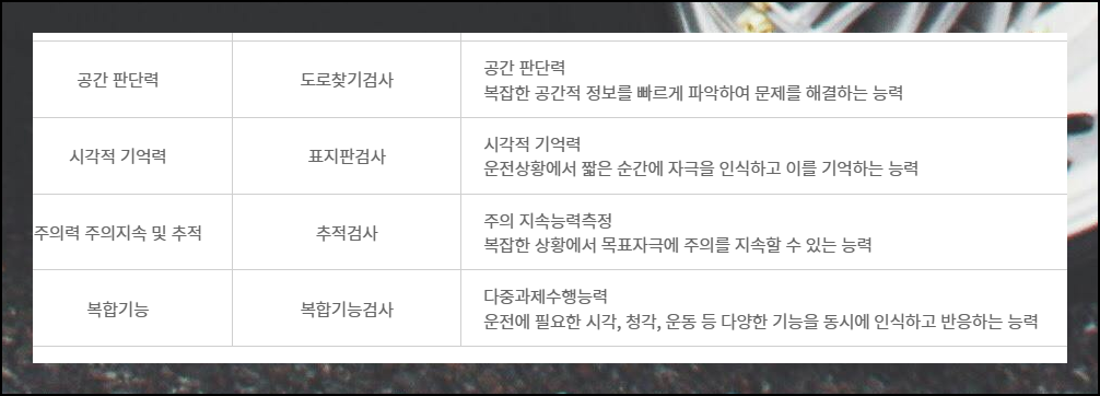 실제 운전 환경과 비슷한 상황에서 운전자의 판단력을 확인합니다. 도로를 찾고 표지판을 기억하며, 탑승자가 있는 차량을 구분하는 등 4가지 항목을 체크해요. 이는 실제 도로에서 마주칠 수 있는 상황들을 안전하게 대처할 수 있는지 보는 거랍니다. 특히 고령운전자분들은 이러한 종류의 테스트에 익숙해질 필요가 있어요.
