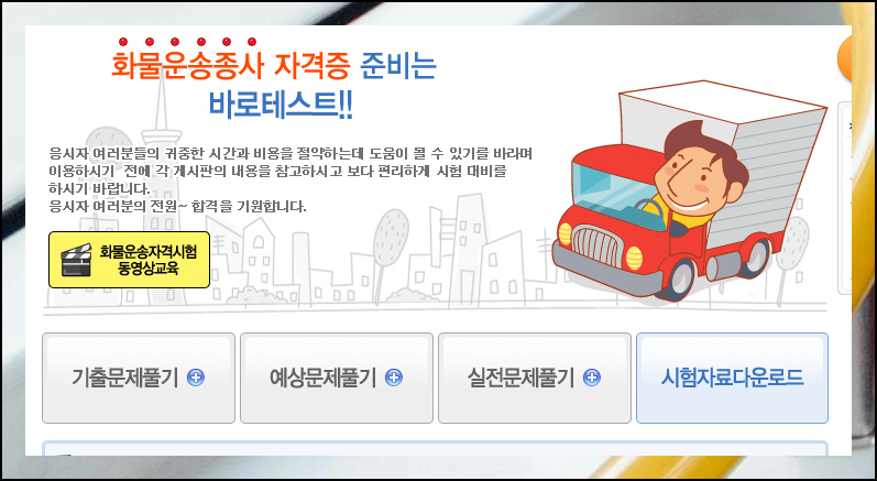 홈페이지에 접속하면 우측에 "바로 테스트" 메뉴가 보입니다. 여기서 화물운송종사 자격시험을 선택해 주세요. "버스운전"이 아니라서 당황하실 수 있는데요. 조금만 진행해보면 어떤 의미인지 이해할 수 있습니다.