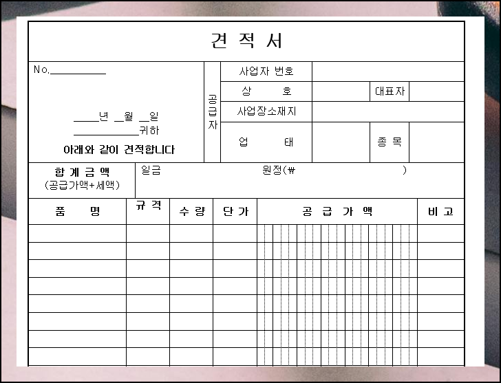 실무자들이 깔끔한 견적서 양식을 찾느라 시간을 허비하시는 것을 알고 있어요. 그래서 바로 활용할 수 있는 무료 견적서 양식을 준비했습니다. 지금 바로 다운받아 사용하실 수 있어요. hwp 및 doc 파일로 제공되어 아래아 한글이나 마이크로소프트 워드에서 작성 및 편집이 가능합니다. 체계적으로 정리된 항목들 덕분에 작성도 쉽고, 받는 분들도 내용을 쉽게 이해할 수 있어요. 이제 양식 디자인 때문에 고민하지 않아도 되니 편하시죠. 무료다운 받을 수 있도록 아래에 첨부했습니다.