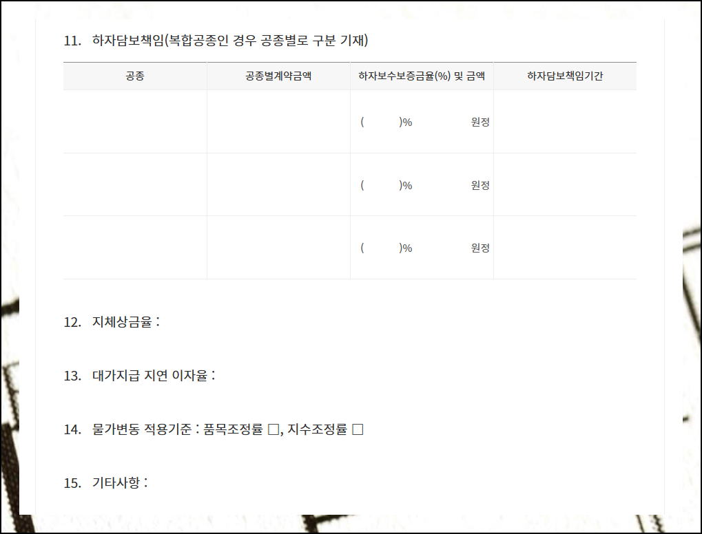 이 표준화된 양식에는 공사명, 위치, 착공일, 준공예정일부터 세부 계약조건까지 꼼꼼히 작성할 수 있는 항목들이 포함되어 있습니다. 게다가 최신 법규와 업계 관행이 반영된 양식을 사용하면 법적 보호를 더욱 확실하게 받을 수 있습니다.