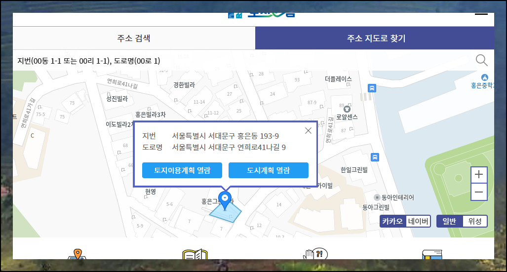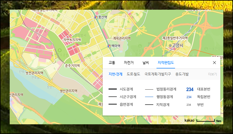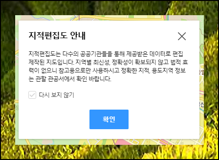 [지적편집도] 버튼을 누르면 화면이 토지 도면으로 변환됩니다. 디스플레이 우측 하단의 옵션창에서 지번 및 경계, 도로철도, 국토계획 및 개발지구, 용도 및 개발 중 원하는 항목을 선택할 수 있어요.