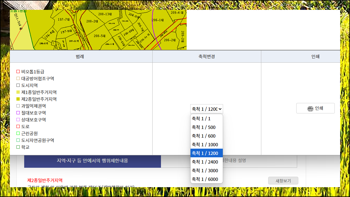[도면 크게 보기] 버튼을 클릭하면 더 넓은 관점으로 지적도를 볼 수 있고, 축척 변경도 가능합니다. 범례에 표시된 고도지구, 정비구역, 일반 철도 등의 항목을 참고하면 토지와 주변 환경을 더 정확하게 파악할 수 있어요.