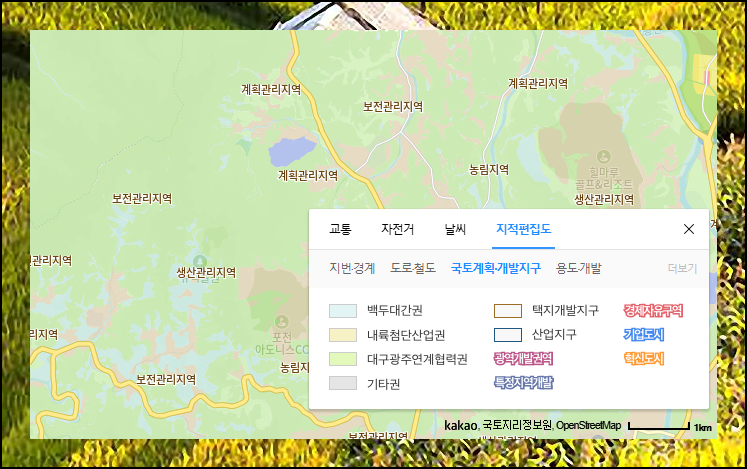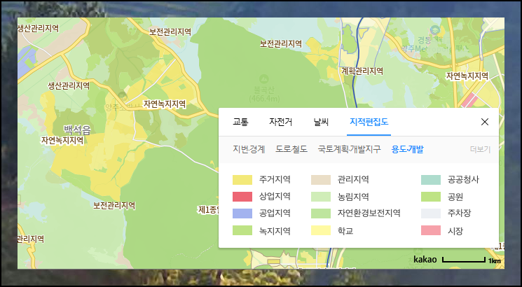 용도 및 개발 옵션을 선택하면 해당 구역이 주거지역인지 상업지역인지 즉시 확인 가능합니다. 공업, 녹지, 관리, 농림지역뿐만 아니라 시장, 주차장, 공원, 공공청사, 학교 등 다양한 구분을 색상으로 표시해 보여줘요. 이런 정보는 부동산 거래나 개발 계획 시 중요한 자료가 됩니다.