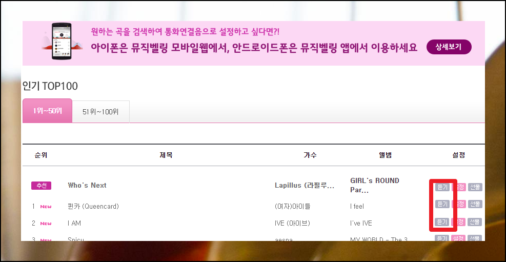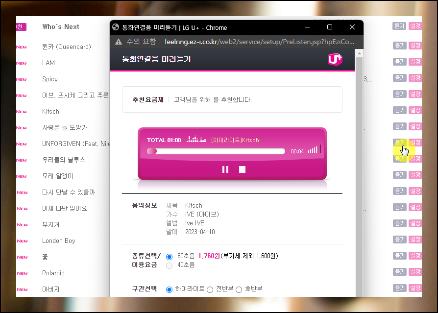 원하는 음원을 발견했다면 "듣기" 버튼을 눌러 미리 들어볼 수 있어요. 컬러링 설정 전에 음원의 품질과 가격을 확인하는 것이 좋습니다. 마음에 든다면 미리듣기 창의 "설정" 버튼을 눌러 바로 lg 컬러링으로 적용할 수 있습니다. 이제 나만의 특별한 통화연결음으로 멋지게 꾸며보세요.