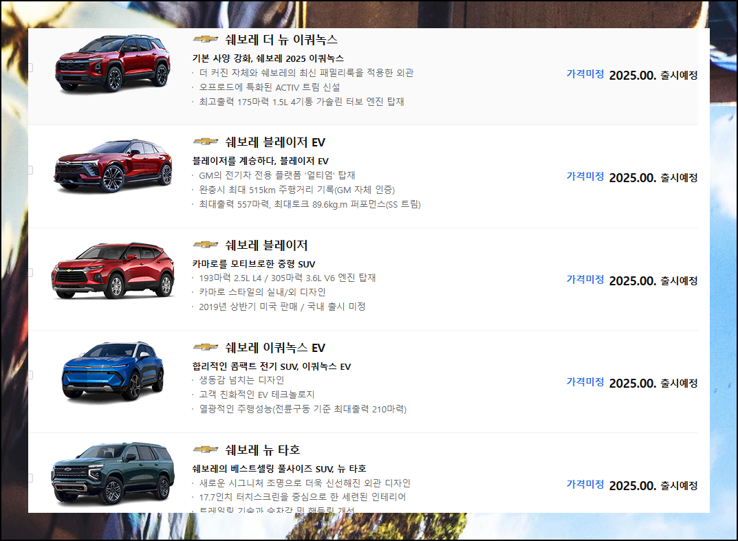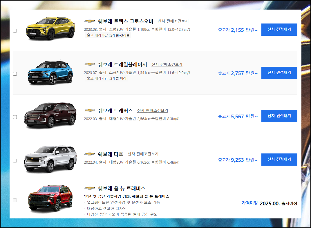 인기 순으로 정렬된 목록이 나타납니다. 구매비용은 최소금액으로 표시되어 있으니, 세부 정보를 위해 관심 있는 쉐보레자동차의 모델명을 클릭해주세요.