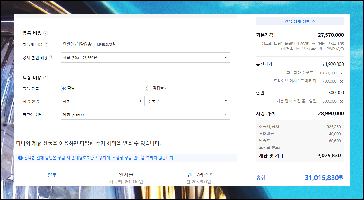 면세조건과 등록지역을 선택하면 취득세, 공채비용이 자동으로 계산됩니다. 쉐보레 자동차는 탁송료를 별도 협의해야 하니 참고하세요. 이제 화면 오른편에서 완성된 쉐보레자동차 가격정보를 확인할 수 있습니다.