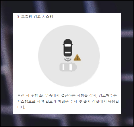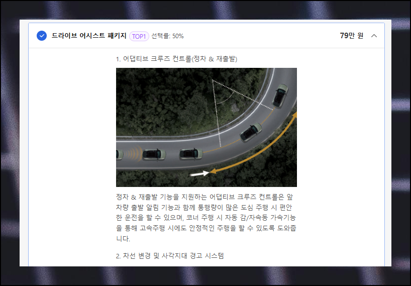옵션 가격표 옆 화살표를 클릭하면 설명과 사진이 나타납니다. 예를 들어, 쉐보레자동차의 드라이브 어시스트 패키지에는 어댑티브 크루즈 컨트롤, 차선 변경 및 사각지대 경고 시스템, 후측방 경고시스템이 포함되어 있네요.